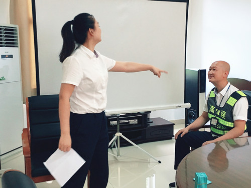 圖為員工扮演駕駛?cè)藛T 此次培訓一改枯燥乏味的傳統(tǒng)形式,工作人員結合平時窗口實際工作,分別擔任角色扮演,生動而又形象地演繹窗口服務,真實地反映出收費員在收費過程中遇到的各類情景。比如:ETC車道無法正常通過、遇堵車分流、駕駛員情緒激動、綠農(nóng)車混裝未達到免費、入口如何勸離超限車輛等各類突發(fā)事件應急處理辦法。