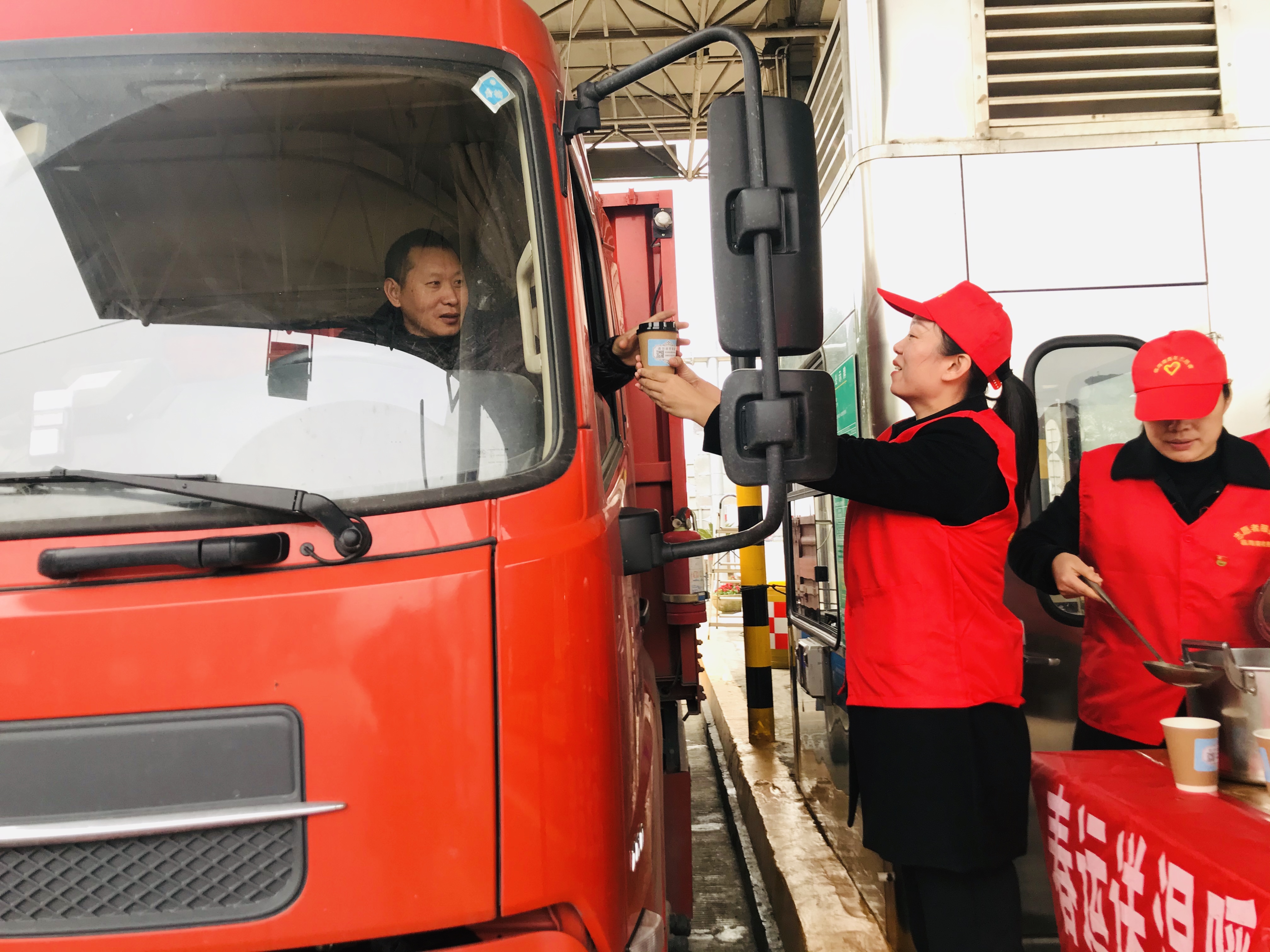 圖為送溫暖活動現場 活動當天,雖然氣溫較低,但在臨海南收費所出口處,身著紅色馬甲的志愿者們頂著嚴寒,依然熱情地為過往司乘人員遞上一杯杯滾燙的姜茶、紅棗茶,并向他們提供問詢、指路、飲水和提示路況信息等便捷服務。除了設置志愿者便民服務臺,臨海南收費所還為過往駕駛員和出行旅客臨時增設休息室,提供道路溫馨提示服務,同時還在車道配備了飲水機、藥品、修車工具等免費便民物品。
