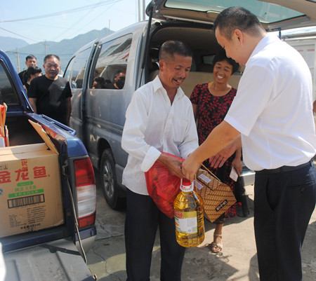 圖為臺州收費所黨支部書記王小勇給困難戶送上慰問品 潘山頭村共有22戶困難戶,因時間關系,臺州收費所黨支部一行走訪了其中3戶困難家庭,對于其他19戶困難家庭委托該村“兩委”領導代為慰問。每到一戶,支部書記王小勇都詳細詢問了解困難群眾的生活情況,勉勵他們積極面對生活,戰勝困難,同時為他們送去了中秋月餅、食用油、干果等慰問品及節日問候。
