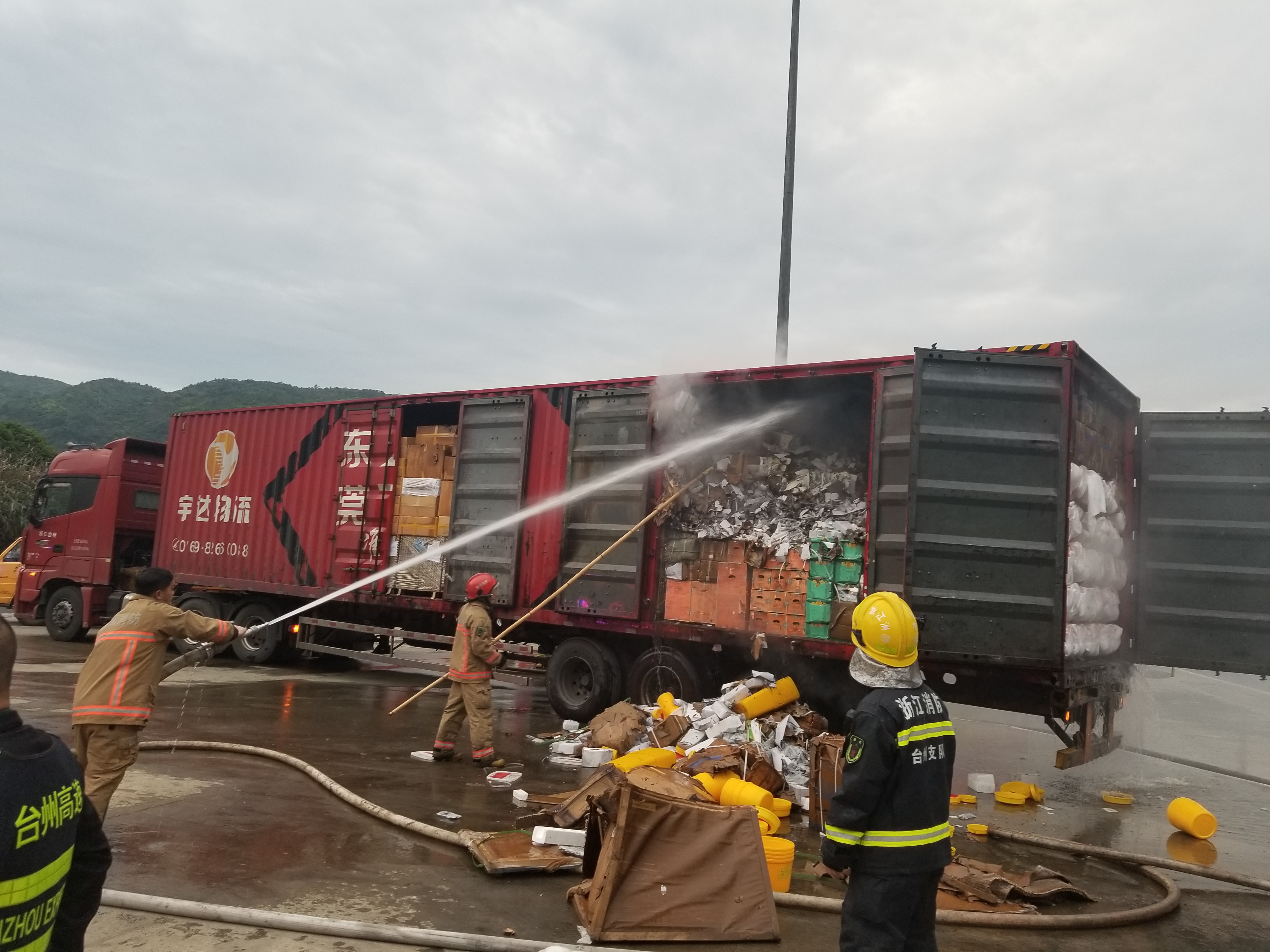 圖為滅火現場 萬幸的是,恰逢溫州高速交警巡邏車經過,隨即在該貨車后方預警,很快的所巡邏車、消防車先后到達現場協同滅火。由于該車貨物較多,且裝載物皆為紙箱和塑料,集裝箱底層溫度較高,一時只能將明火撲滅,但車廂內仍有大量煙霧,為了安全,車子必須盡快撤離隧道,執勤隊當即決定讓駕駛員把車開往南廣場繼續滅火,消防車則一路緊隨其后滅火,以防火勢變大。 05:02分,大貨車終于開至南廣場,消防隊員對車上的貨物進行清理,才徹底將此次火災撲滅,隧道恢復安全行車。