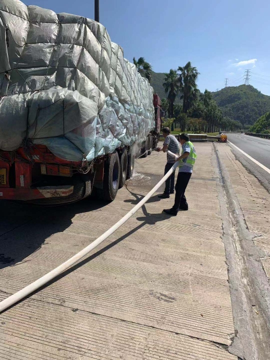 圖為消滅隱患現(xiàn)場 同時,中控員密切關(guān)注車輛動向,13:37,中控員在隧道南廣場發(fā)現(xiàn)該車,巡邏車立即奔赴現(xiàn)場,該車后輪胎剎車位置在冒煙,司機正用礦泉水澆輪胎,隊員們見狀,火速上前把消防栓打開,接上消防水帶,交與該車司機,托著消防水帶,對準輪胎接連猛射,冷卻剎車片,輪胎終于沒有冒煙,一場隱患被隊員消除了。 據(jù)悉,該輛半掛車因輪胎爆炸,引起冒煙,司機卻想著從下一個高速出口,幸好隊員們監(jiān)控及時,出警迅速,施救到位,把隱患扼殺在搖籃里,沒在隧道內(nèi)發(fā)生火災(zāi),不然后果將無法想象。 現(xiàn)場,隊長告知司機,萬一車輛發(fā)生火災(zāi),請把車停在隧道外,若在隧道內(nèi)發(fā)現(xiàn)車輛起火,請加速駛往隧道口,盡快駛離隧道,避免造成人員傷亡。 陳智慧