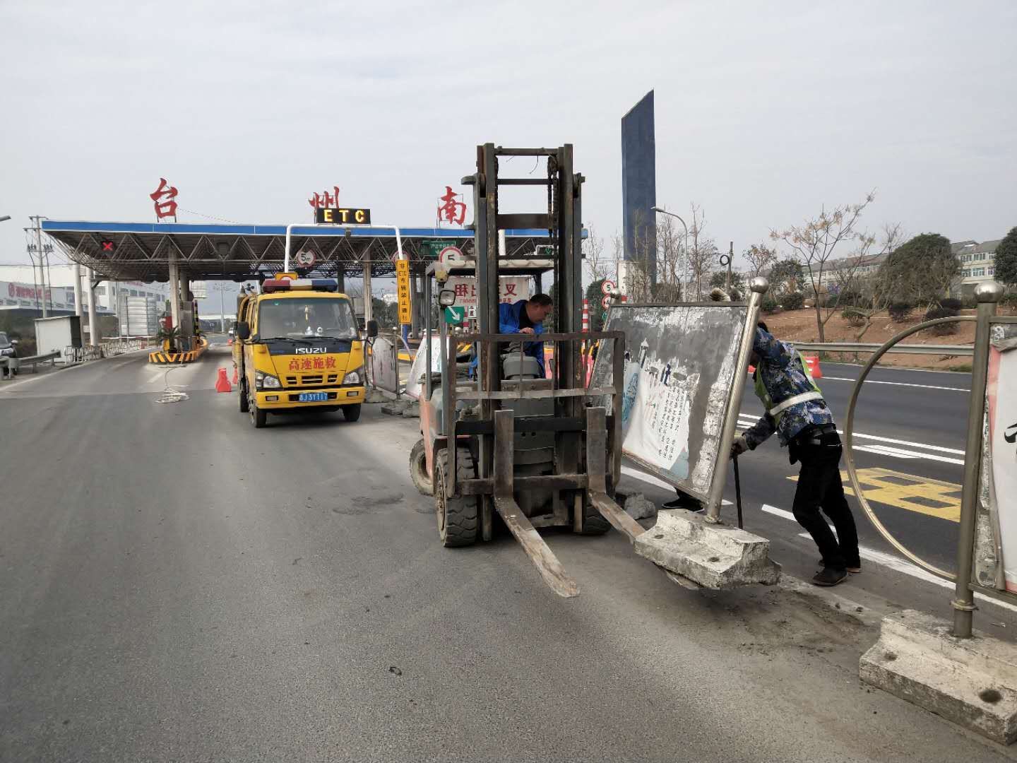 零費(fèi)用清除沉重的廣告式隔離帶 “副站匝道外的廣告式隔離帶能不能幫忙清除下?” 在接到臺(tái)州南收費(fèi)所的“求助”電話后,施救中心負(fù)責(zé)人馬上發(fā)動(dòng)人員,迅速聯(lián)系了外協(xié)單位-----臺(tái)州市路橋通遠(yuǎn)車(chē)輛施救有限公司,開(kāi)動(dòng)鏟車(chē)奔赴現(xiàn)場(chǎng)。 據(jù)悉,臺(tái)州南副站匝道廣告式隔離帶比較長(zhǎng),而且有損壞,不美觀而影響站所形象,需要全部更換成水馬。但是其底部的水泥墩非常沉重,人力不能搬動(dòng),所以該所希望施救中心幫忙清除這些廢舊物。