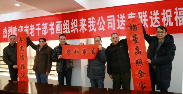 市老年書畫研究會會長楊通河一行來公司送春聯(lián)送祝福 1月17日下午,市老年書畫研究會會長楊通河,市直機關(guān)老干部書畫協(xié)會領導施巨日、陳孔梅一行來公司送春聯(lián)送祝福,感謝公司對研究會的支持和關(guān)愛,祝愿公司在新的一年里紅紅火火,萬事如意,經(jīng)營發(fā)展越來越好。