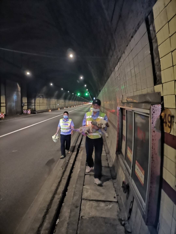 為確保安全,執(zhí)勤隊員們帶上手套,拿著掃把和麻袋,到達現(xiàn)場后發(fā)現(xiàn)是一只白色的拉布拉多犬,它一動不動地趴著,可憐巴巴地看著隧道里的車子極速而過,很顯然小狗感覺到害怕,知道趴在這里才是最安全的。隧道所安保人員陶文輝再三確認小狗沒有攻擊意圖后,試著慢慢靠近它,給它喂食香腸,并耐心安撫,直至順利地將其抱起,帶上了巡邏車。狗是靈性的動物,認準(zhǔn)了第一個抱起它的陶文輝,乖乖地依偎在他的懷里。 此前,隧道里從未出現(xiàn)寵物狗被遺忘的事,執(zhí)勤隊長忙回到監(jiān)控室查看錄像,準(zhǔn)備幫它尋找主人,經(jīng)過仔細查找終于發(fā)現(xiàn)隧道里有過一次大堵車,小狗就是那個時候被主人遺忘的。按照時間推算,這條小狗已經(jīng)在隧道里呆了近14個小時,還好它聰明,趴在那兒一動不動沒有到處亂跑。最后經(jīng)過半個多小時的查找,隊長終于與車主取得聯(lián)系,晚上22點左右,車主來到大溪嶺隧道所認領(lǐng),多次感謝我們對小狗的救援和照顧。 孫鵬