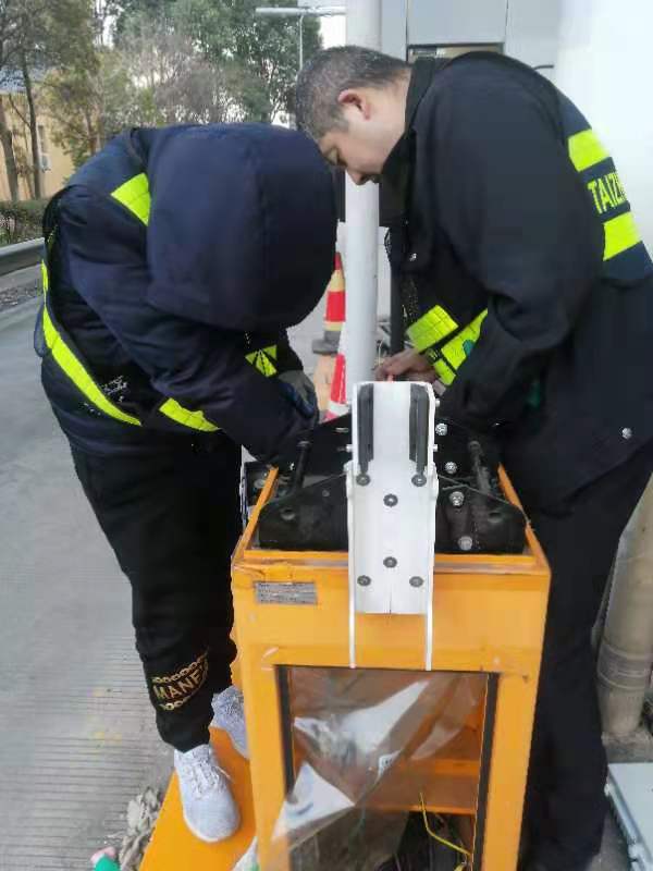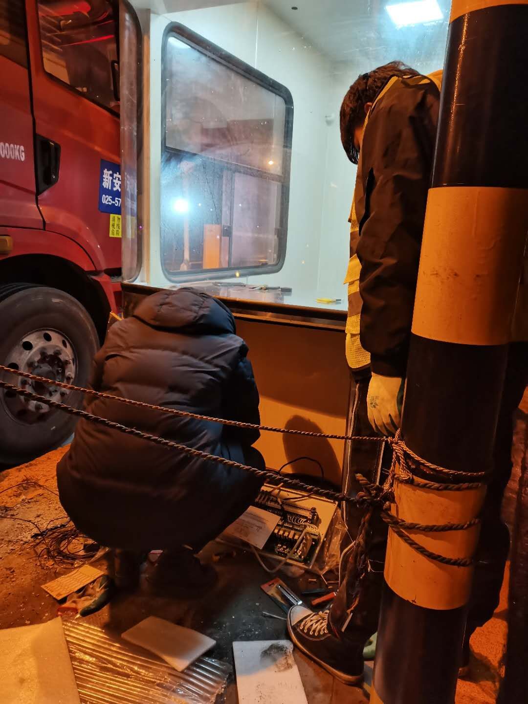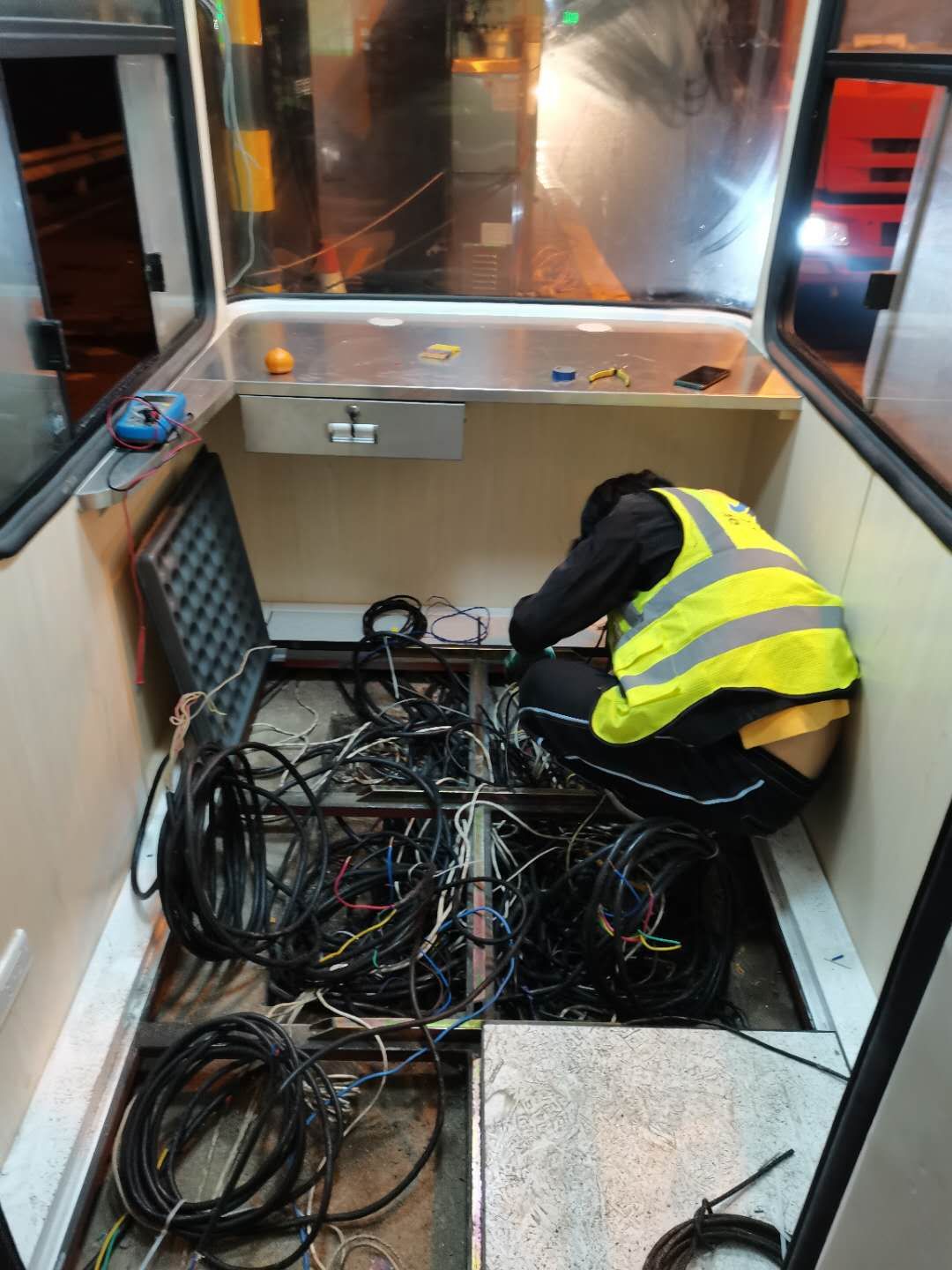 21日下午4點左右,訂購的新崗亭和損壞的設備設施陸續(xù)到位,中心值班人員協(xié)同設備廠家一起將其安放并固定至車道原位置。因崗亭傾倒時拉斷了底下很多線纜,在拆除設備時又因為緊急搶修需要沒有作相應標注,現(xiàn)場各種電線接頭雜亂如麻。考慮到夜間查線、接線存在一定的安全隱患,也不利于施工,搶修人員決定第二天再戰(zhàn)。
