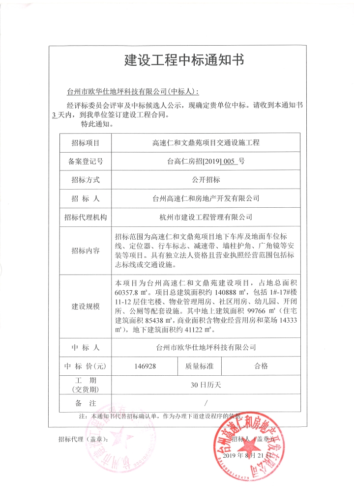 高速仁和文鼎苑項目交通設(shè)施工程中標(biāo)通知書