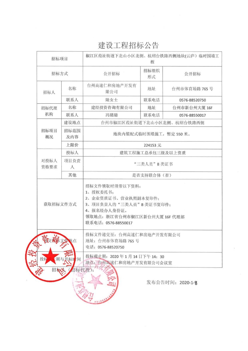 椒江區葭沚街道下北山小區北側、杭紹臺鐵路西側地塊(云廬)臨時圍墻工程招標公告