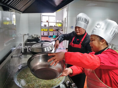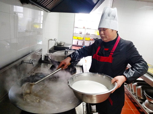 浸了一夜的早米,用石磨磨成米漿,細(xì)膩而幼滑,被靜置在盆里。“一般都用米粉泡水,口感粗糙,而且吃起來沒有香頭。”利花一邊說,一邊將香腸切碎與豆腐、冬筍、胡蘿卜、芹菜、香菇、蠶豆瓣翻炒著。旁邊的大鍋里,長長的豆面在骨頭湯里翻滾著,像一棵棵舞蹈的海草。徐徐倒入的米漿,被不停地攪拌,“要是粘到鍋,就會有焦糊味,這鍋羹就算廢了。”米漿好像不夠,利花有些懊惱,“要是在家里,米漿都會多準(zhǔn)備一些,不夠就隨手添,我?guī)У竭@里就這些,也沒得加了。”就叫在一邊做幫手的妹妹寶花用面粉和山粉(也就是番薯粉)摻水拌起來,倒入鍋里,湯漸漸濃稠起來,倒入之前炒好的配料,加上切得細(xì)細(xì)的綠綠的芥菜梗、芥菜葉、海蠣,鍋里不時冒起大泡,香氣四溢。 為照顧吃不慣糟羹的同事,食堂還準(zhǔn)備了一鍋甜的山粉糊。來自臺州各縣市區(qū)的同事,按各自飲食習(xí)慣選擇了咸的或甜的。有說芹菜的味道蓋過了芥菜清香的,有說沒有加入芋頭口感不夠糊的,但撲鼻的香氣和濃厚豐富的口感立刻讓人忘了挑剔。對我來說,碧綠的芥菜葉和白胖的海蠣肉是整碗羹的顏值擔(dān)當(dāng)和靈魂所在。 每個元宵節(jié),對于在崗的同事們是沒有花燈可看、沒有燈謎可猜的,也不能與家人聚在一起吃羹。車道上此刻正是流量高峰期,大家匆匆吃完,都要趕著上崗。食堂大姐把多出的糟羹和山粉糊放進(jìn)蒸飯鍋保溫,叮囑大家下班后再來吃點,這個吃了不扛餓。此時,除了食物最能體現(xiàn)節(jié)日氣氛外,還有那一份特意為你留著的溫?zé)岣屓烁袆印?/span> 鄭瑛芝