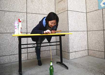 圖為職工正在向啤酒瓶扔筷子