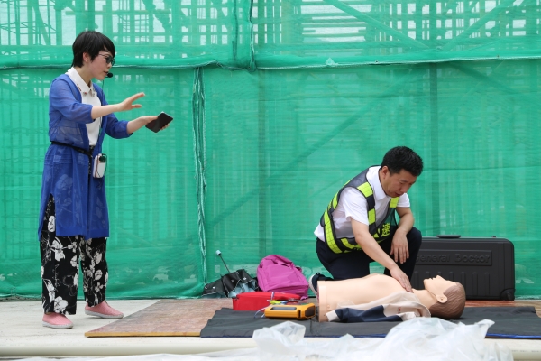 圖為活動人員參加心肺復蘇實操演練 此次演練的第二項重頭戲是心肺復蘇術培訓,建筑工地多為臨時工棚且露天作業,受臺風影響較大,心肺復蘇對于遭遇意外的施工人員來說如同救命稻草。高速集團安保部邀請了臺州職業技術學院副教授李美芬到演練現場進行心肺復蘇術培訓,李美芬詳細講解了心肺復蘇術和AED的理論知識、操作要領和具體方法,并規范熟練地進行了現場演示。隨后參與演練的各部門代表上臺學習實操,李美芬細心指導每一個動作,耐心講解每一個要點,教學效果顯著,有效提高了參演人員的急救技能。 防汛防臺無小事,安全生產有保障,房產集團下有多個在建工程項目,此次演練能夠進一步強化現場人員的防汛防臺意識,普及自救急救知識,提高工程管理人員、施工就業人員的防災抗災和應急處置能力。 盧丹麗
